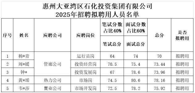 附件:惠州大亞灣區(qū)石化投資集團有限公司2025年招聘擬聘用人員名單